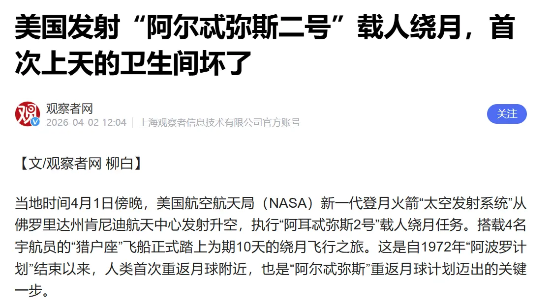 原本计划在2024年11月实施的阿尔忒弥斯2号载人绕月飞行任务,由于种种原因推迟到了今年2月,后来又推迟到4月2日,现在这一艘飞船已经成功发射升空了,4名宇航员乘坐这艘飞船去月球,开展载人绕月飞行任务。