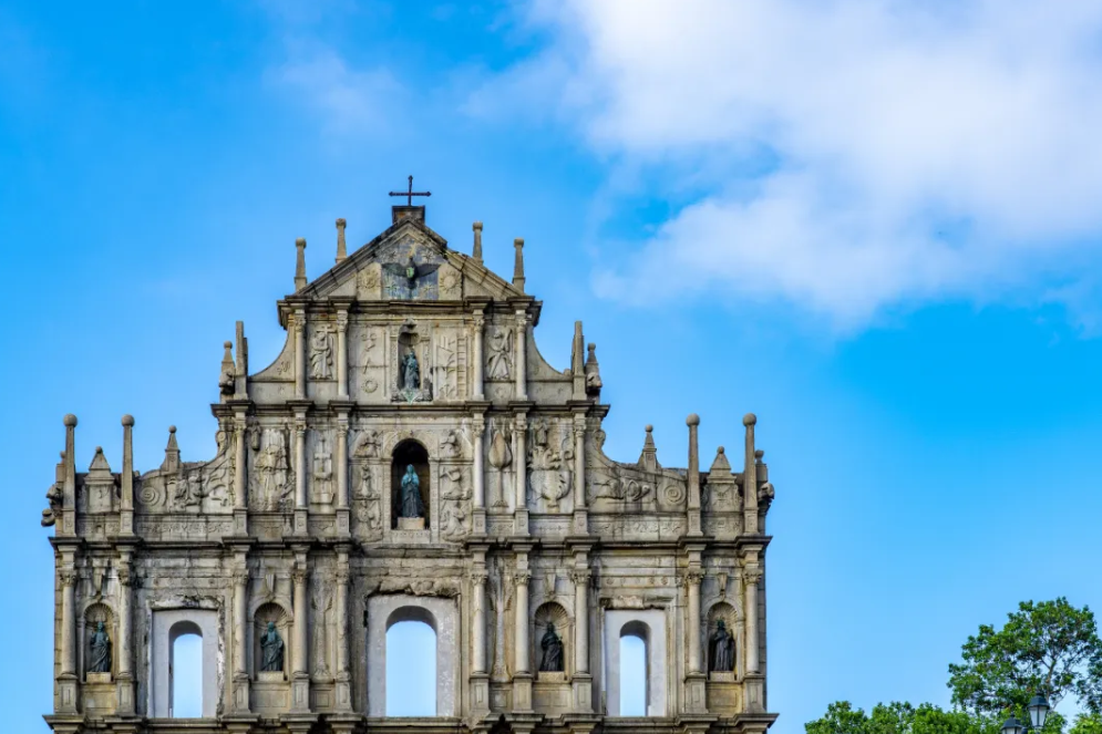大三巴牌坊,澳门的标志之一,也是澳门著名的人文古迹,牌坊作为中西文化交融的艺术品,融合了中外建筑艺术的精华,历经风雨侵蚀而不倒,很有历史底蕴,湛蓝的天空下,古老的建筑,精美的浮雕,拍照打卡超出片!