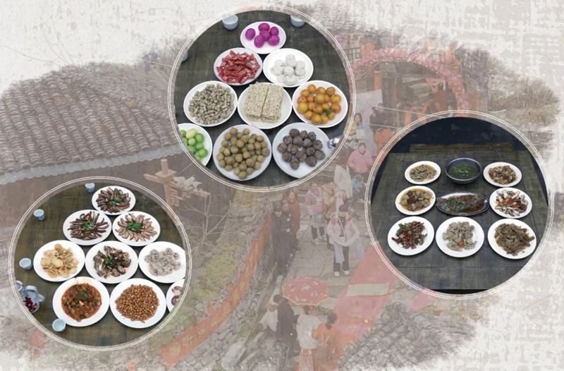 仡佬“三幺台”,是待客的非遗盛宴。第一台茶席,九盘果品糕点配金黄油茶汤,油茶醇厚中藏着大山呼吸;第二台酒席,自酿苞谷酒与卤菜碰撞出热烈乡土气息;第三台饭席,九大碗肉菜以辈分动筷,长辈先食的礼仪流淌着尊老爱亲温情。若错过三幺台,美食街的诸多美味不容错过。茅天镇包谷粑,带着田野的质朴香气,土锅蒸制,软糯香甜,一口下去,满满都是儿时的温暖回忆;红丝乡神仙豆腐,由天然植物制作而成,翠绿如玉,口感爽滑,搭配上酸辣适口的蘸料,瞬间驱散暑气;泥高马肉肉质紧实,富有嚼劲,经过独特的烹饪手法,香气四溢,让人回味无穷。此外,金银花烤鸡、马桑菌炖鸡等美食,将地方特产与现代烹饪完美融合,也别有一番风味。