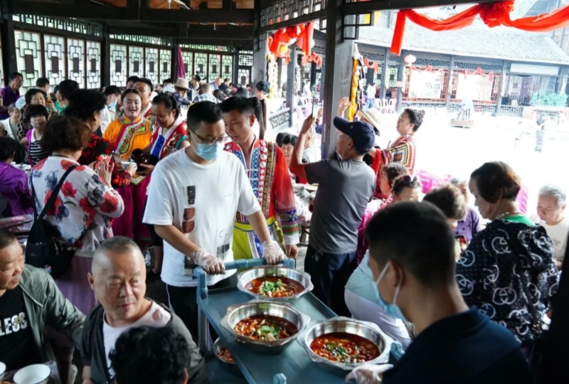 百姓大舞台“村光大道”每周六将如期举行,从此迎来古寨最热闹的时刻。村民、游客、返乡青年同台竞技,唱歌、跳舞、乐器演奏轮番上演,三个环节融入仡佬族非遗技艺与民俗风情。若赶上吃新节,可参与运南瓜比赛、“麻包谷”比赛,观看高台舞狮、傩戏表演,在长桌宴上品尝新米、新豆腐,感受丰收喜悦。夜幕降临,篝火晚会在古戏台前点燃,游客与仡佬族同胞手拉手,围着火堆跳起欢快舞蹈,星夜与火光交织中,民族与现代、传统与创新的边界悄然消融。