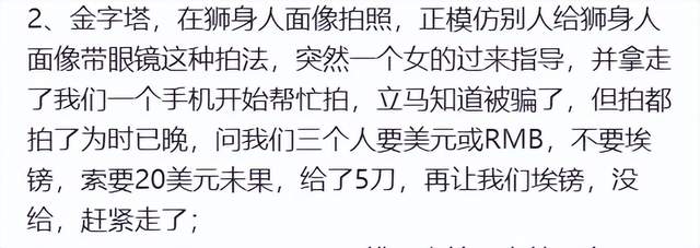 埃及的骗局套路大同小异,主要是在金额上做文章。所以可以提前做好功课,了解当地的大致物价,建议不掏超出预期的钱。