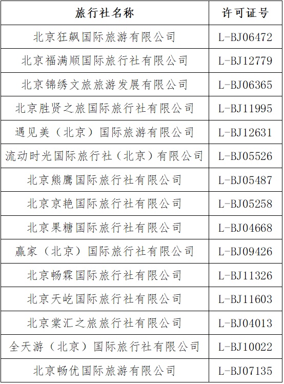 根据我市旅行社涉诉情况统计,现公示10月13日至10月19日,北京市投诉量排名前十五旅行社名单如下: