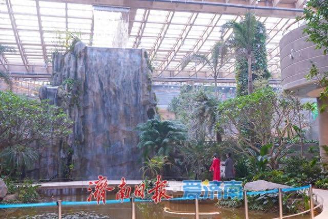 据了解,该瀑布是园区引入黄河元素打造的核心景观,意在呈现‘黄河之水天上来’的意境,同时融入南洋文化理念,形成独特的文化交融氛围。场馆中央种植池培育着南洋亚热带植物,枝叶向上延伸至三层挑高空间;屋顶及四周的玻璃幕墙让内外景观通透交织,与瀑布水景、空中廊桥相互映衬,构建出层次丰富的视觉效果,成为游客打卡新热点。