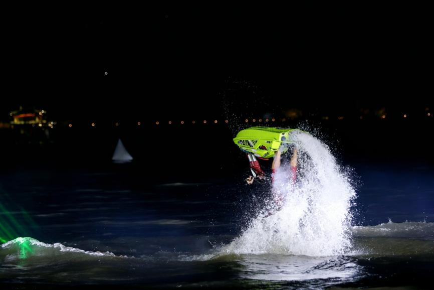 运动员上演绕船360度回旋特技。