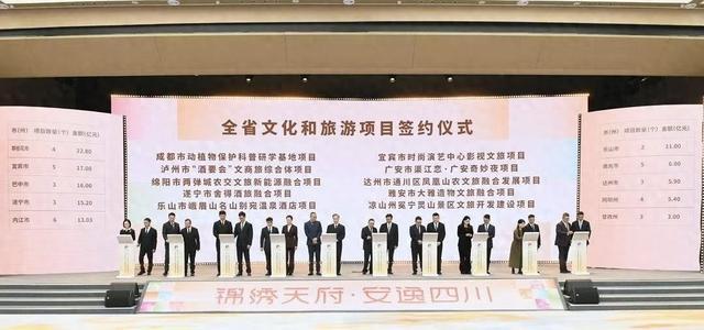 大会以文会友、以旅为媒,聚焦文旅资源优势转化,签约现场环节,浙江户外猩球控股集团与成都市新津区政府、中广核新能源与绵阳市梓潼县政府、北京无问西东文化传媒与宜宾市文旅会展集团等十组代表性项目签约代表依次登台,现场签约金额达135.4亿元。全省21个市(州)共敲定114个重大文旅项目,总签约金额达567.96亿元,涵盖文旅综合体、生态旅游开发、文化IP运营、智慧文旅建设等多个领域。