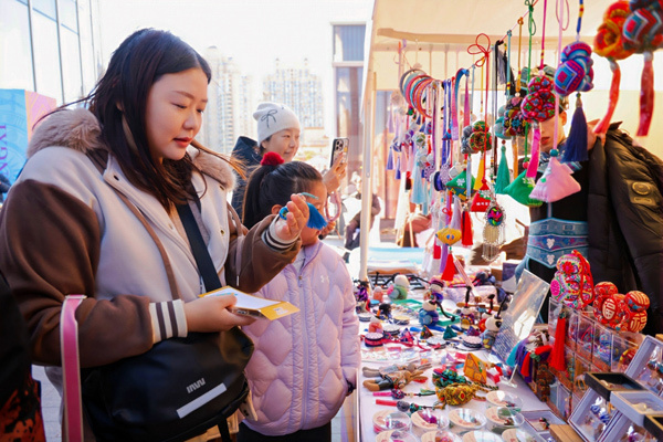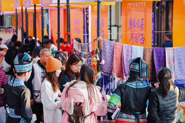 北京市民对“康养旅居 冬游广西”旅游推介活动中展出的广西文创产品很感兴趣。自治区文化和旅游厅供图
