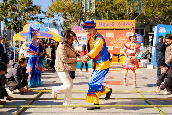 “康养旅居 冬游广西”旅游推介活动在北京精彩上演,游客在活动现场体验跳竹竿。自治区文化和旅游厅供图