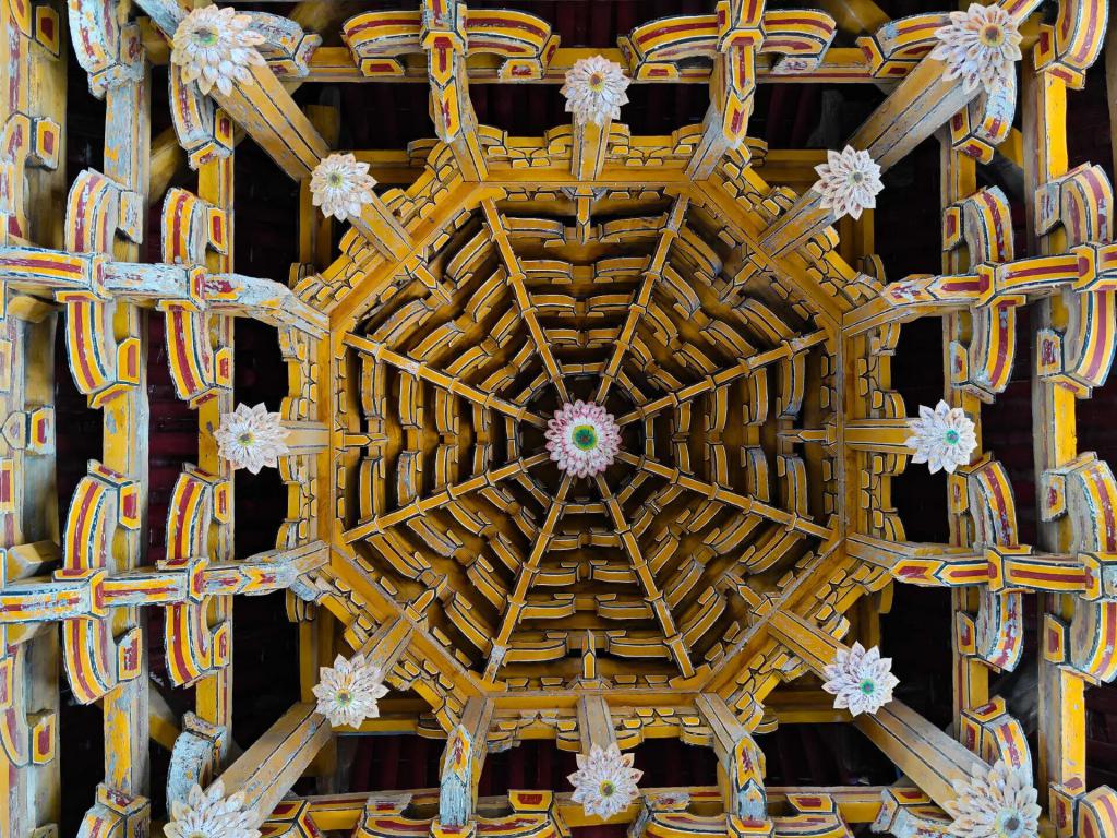 不过要说最壮观的,就是山门二层,头顶上的莲花藻井,每一片花瓣皆以黄、朱、青三色勾勒,好似朵朵莲花飞在空中。