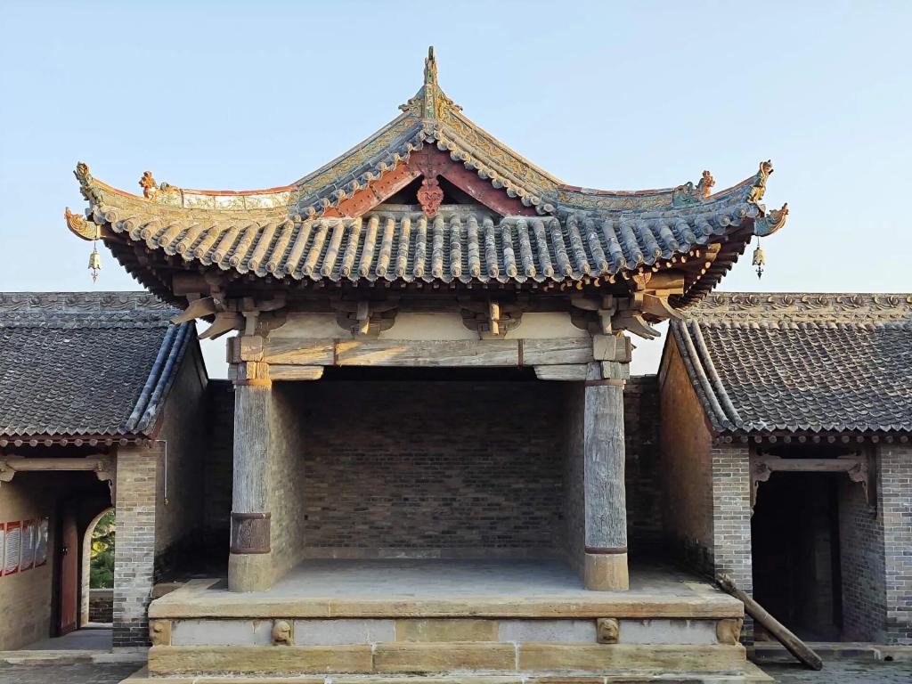 转身,你会发现有一座造型古朴的戏台,斗拱硕大,用材粗壮。