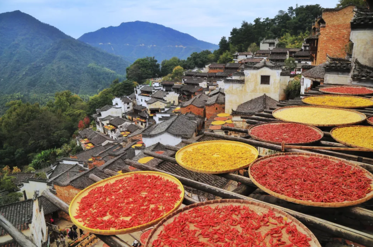 白墙灰瓦的徽派建筑,袅袅炊烟升起,加上极具特色的晒秋风景,层林尽染的红枫,感受岁月静好的古村生活,处处都是令人惊艳的美景。