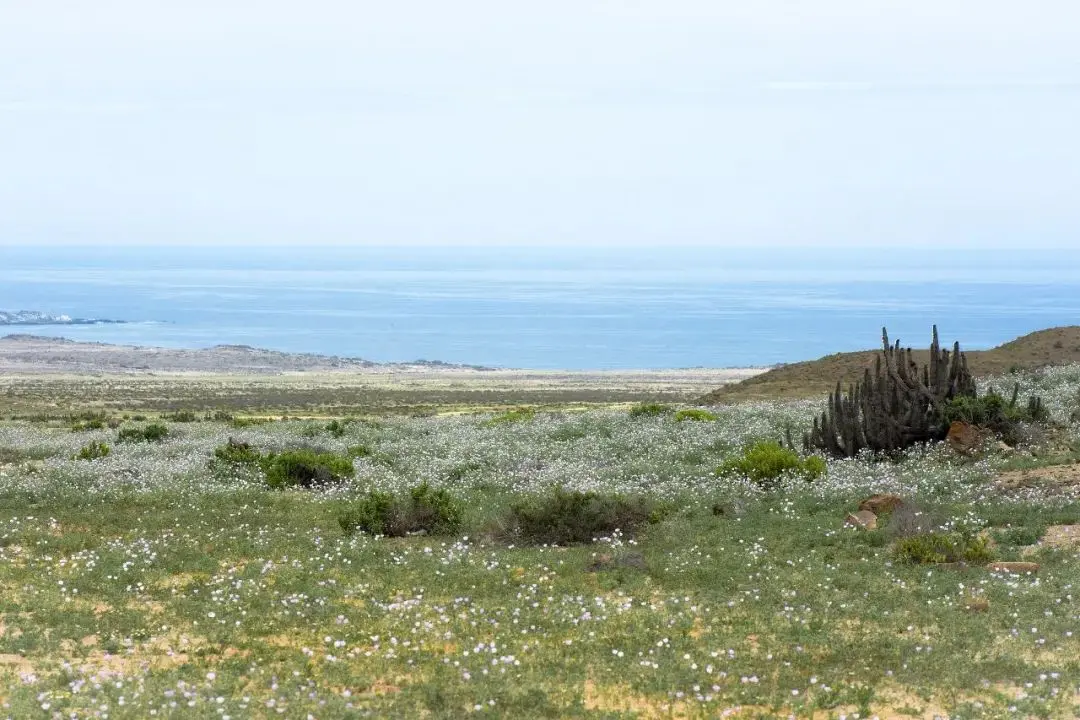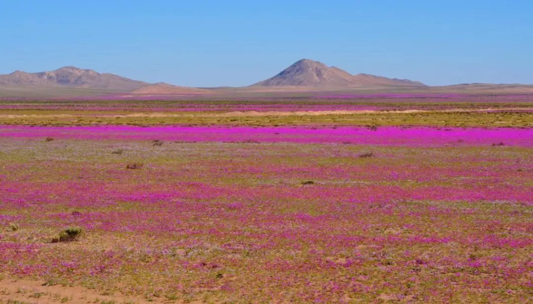 全球变暖大背景下,当厄尔尼诺现象发生时,在一系列海水、洋流、风带的作用下,于太平洋东部的阿塔卡马沙漠附近盛行上升气流,降水量增加,雨水下渗和当地的高温促使沙漠中埋藏的种子迅速发芽、生长、开花。