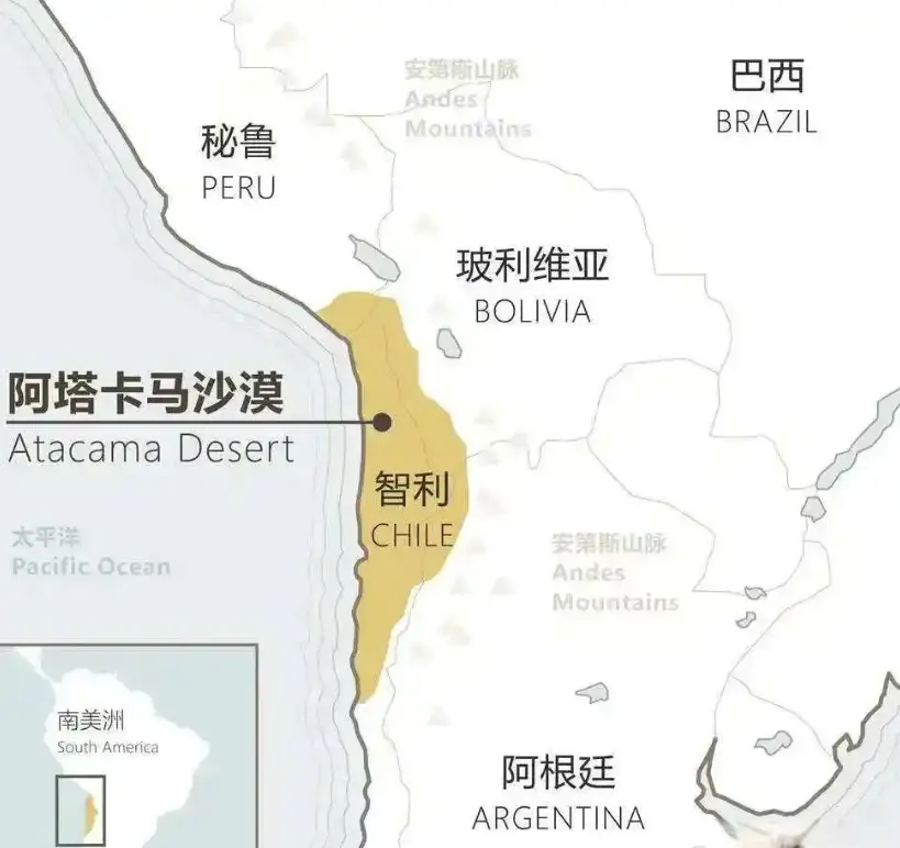 在太平洋东岸——阿塔卡马沙漠,世界上最干旱的地区之一。这里的平均降雨量不到1毫米,其干旱程度是撒哈拉沙漠的数百倍。曾经在1845到1936年的91年间滴雨未下。