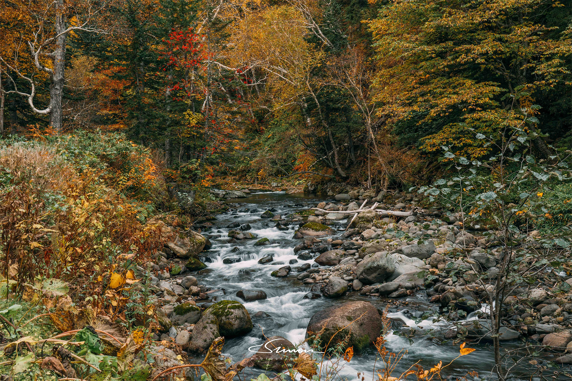 继续向前来到一处小溪。倘若你站在木头搭成的小桥之上,可以看到这条小溪蜿蜒流过,清澈的水面在树木间若隐若现,两旁的树木间与红黄相间的落叶相得益彰,色彩丰富的森林景观也如同一幅油画。这里的空气仿佛格外清新,也带着丝丝凉意,让徒步的我们可以尽情沉浸在大自然的怀抱中,放松身心。