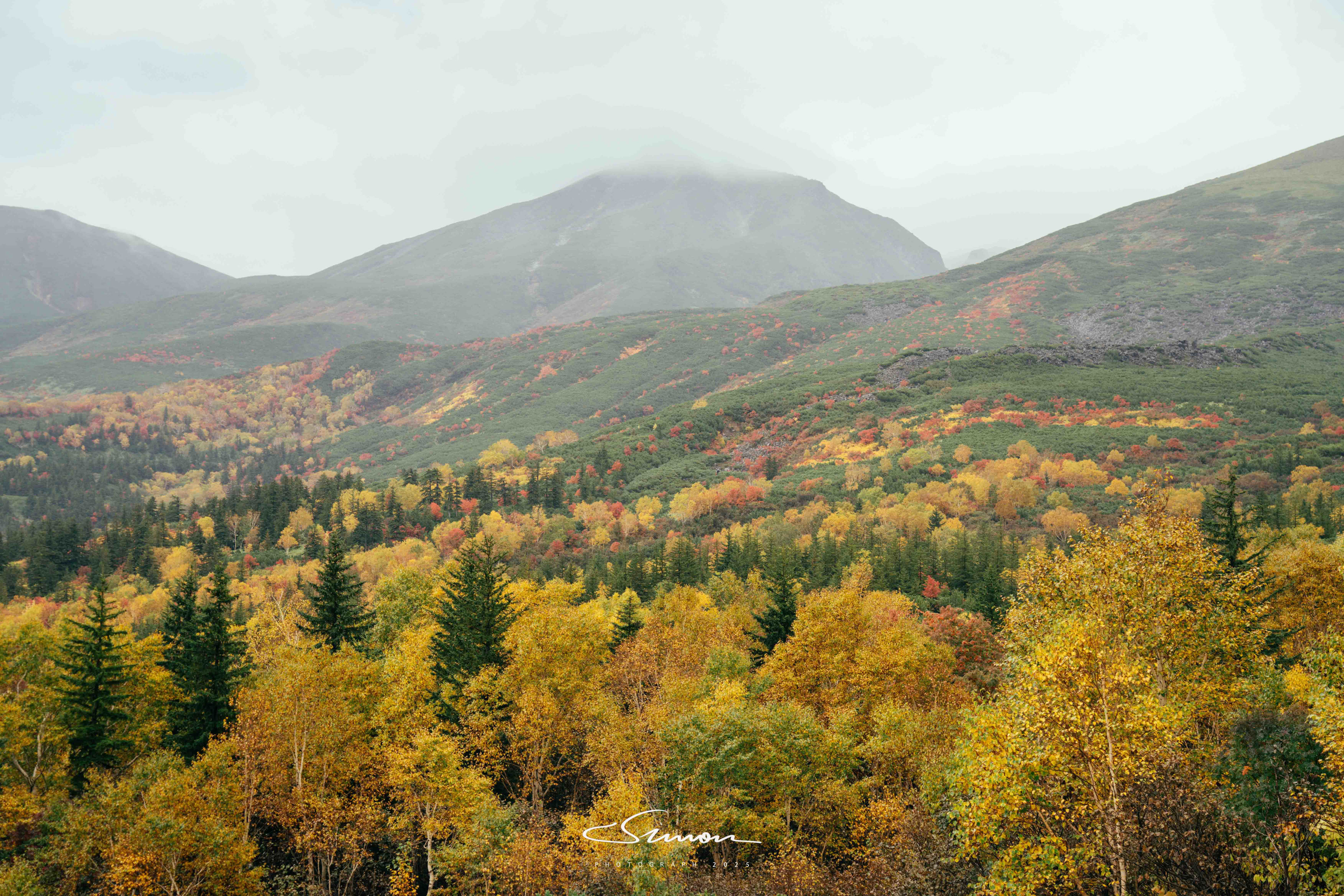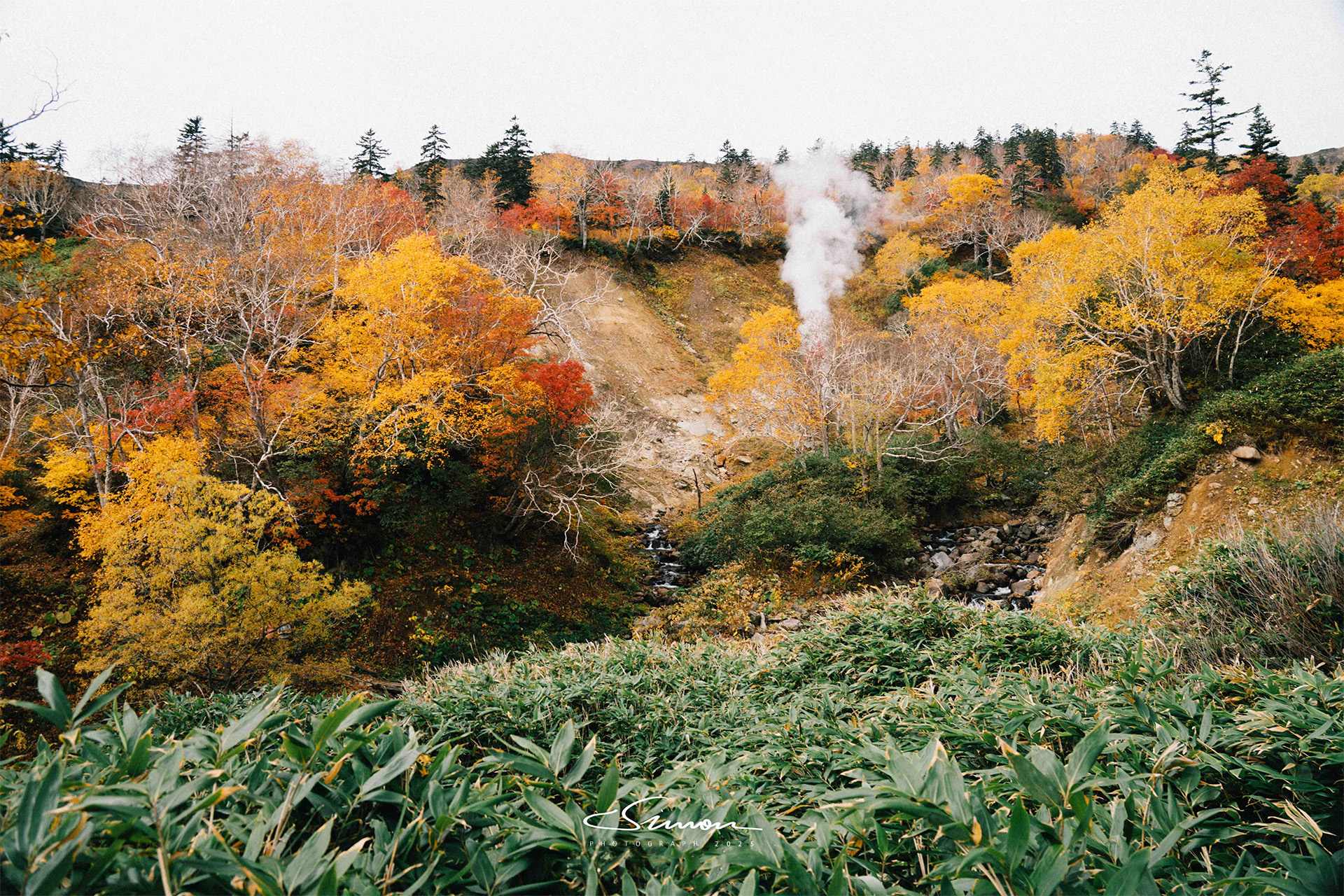 微风拂过,树叶沙沙作响,抬头望向远处的群山,看着这五颜六色的树林,心中只有一句诗词能够形容:「看万山红遍,层林尽染」。雾气中的十胜岳有种矛盾的美——脚下是火山的荒凉土地,远处是生命的繁盛。那种强烈的色彩冲击,就算是现在正在打字的我,也依旧记忆犹新。