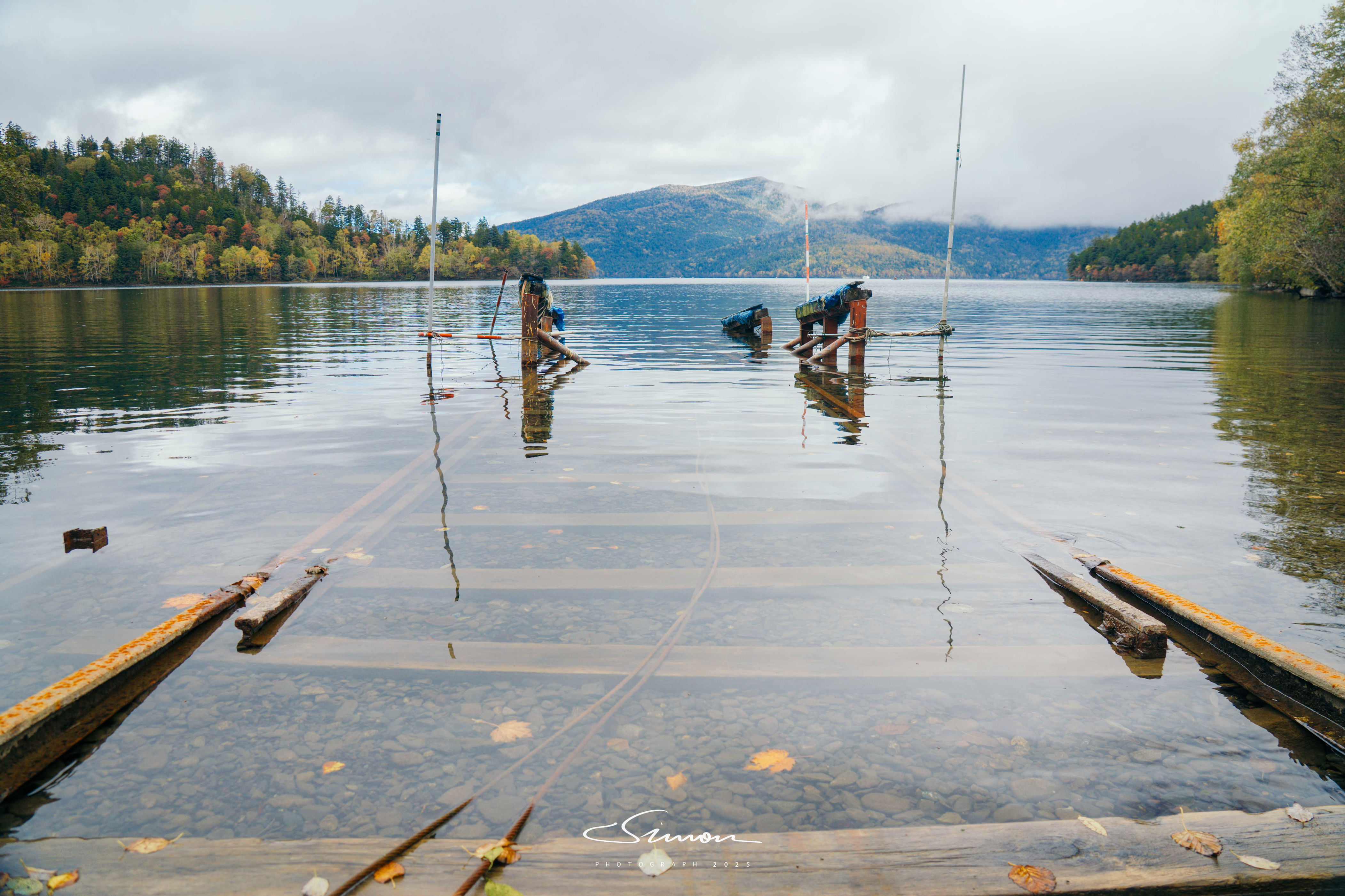 在探寻桥梁遗址之前,我们先绕到了然别湖,探访一条条「湖底铁轨」。然别湖位于北海道海拔最高处,被称为「天空之湖」,四周被群山环抱,湖面在阳光下泛着冷冽的银蓝色光。
