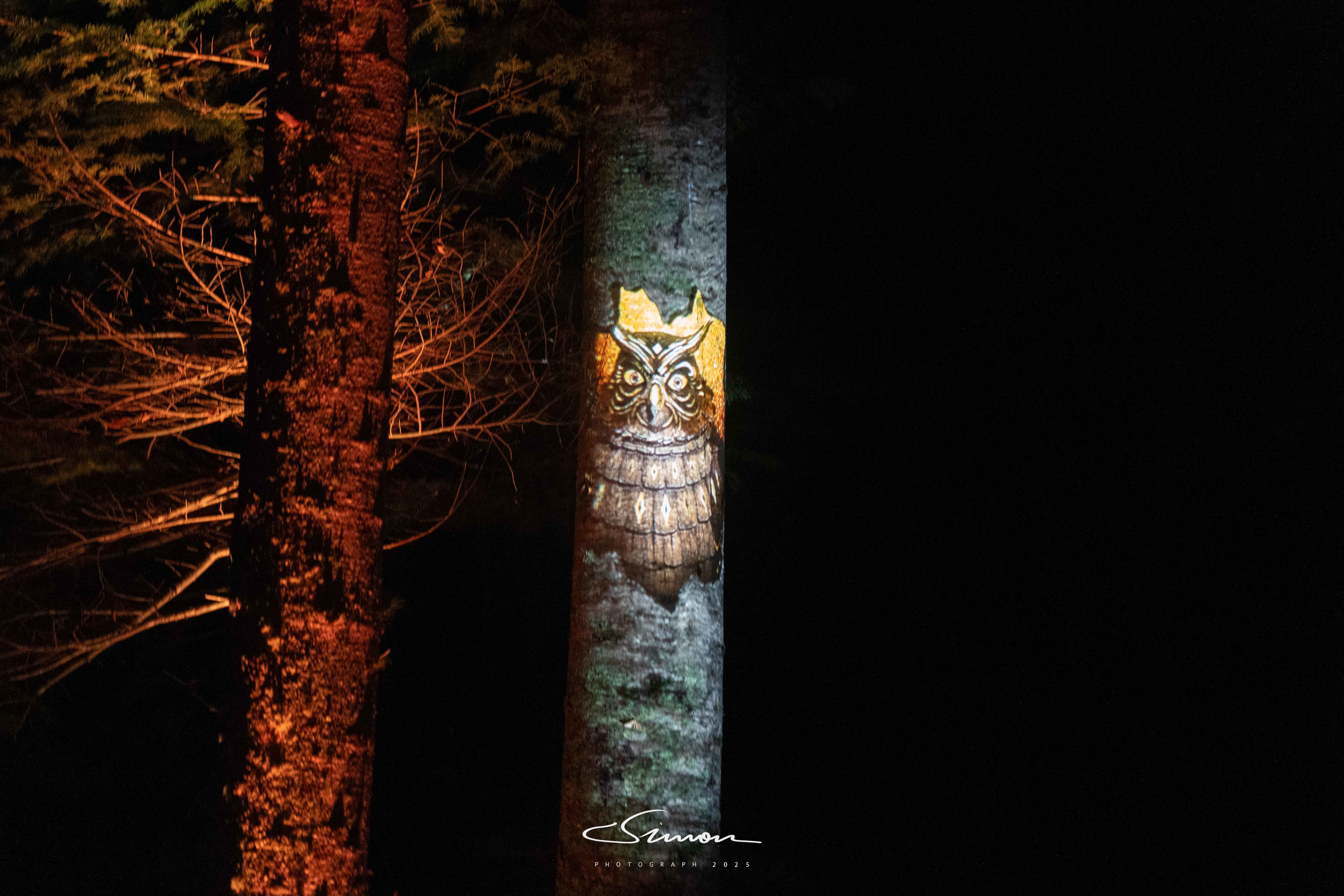 当天的天气也非常好,抬头就可以看到繁星铺满天幕,那种被森林、星空与灯光包围的感觉,是几乎让人忘记现实的存在。整个故事取材自阿伊努族的神话,讲述猫头鹰之神「カムイフクロウ」与人类、自然之间的羁绊。光影、音乐与旁白交织在一起,将这段古老传说以现代的方式重新演绎。