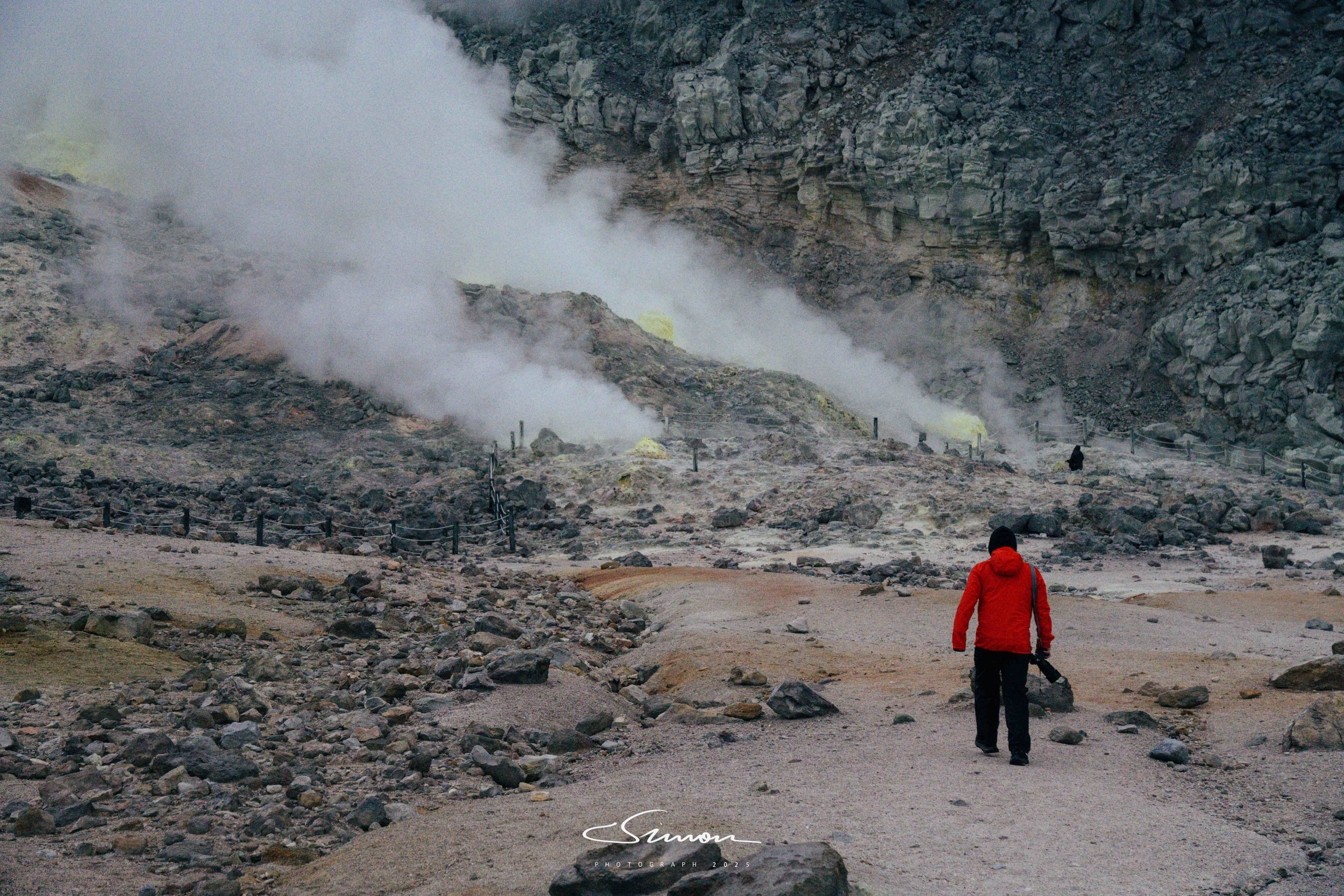 离开摩周湖后,我们驱车前往今天的最后一站:硫磺山。当车子驶入川汤温泉一带时,空气中的气味就开始发生变化,即使窗户紧闭,仍能闻到空气中弥漫着刺鼻的硫磺味;随着味道越来越浓烈,我们也到达了目的地。