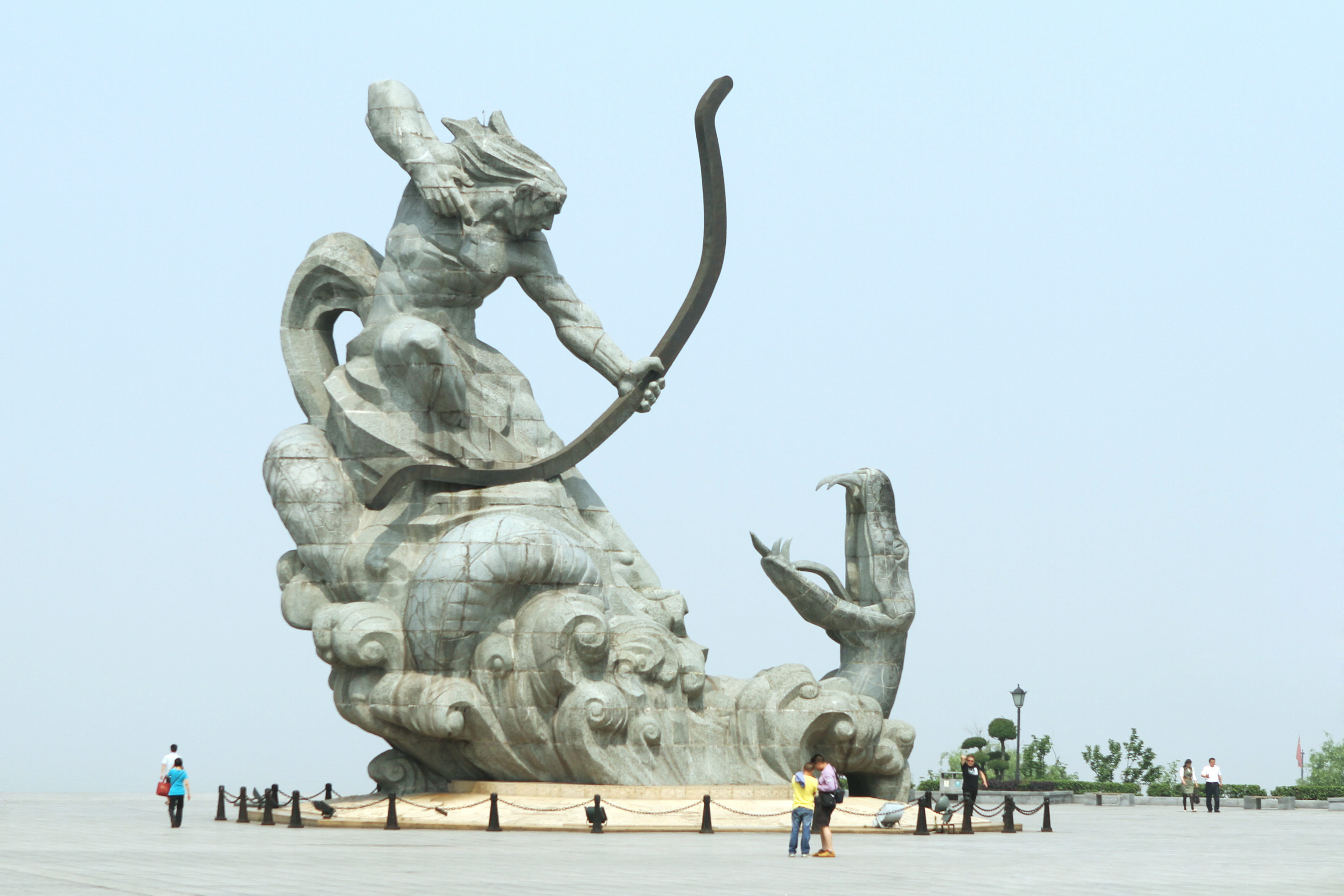 尤其是漫天霞光将广场上“后羿射巴蛇”的雕像笼罩其中,落日与雕像同框,这一刻的定格真的是美极了!