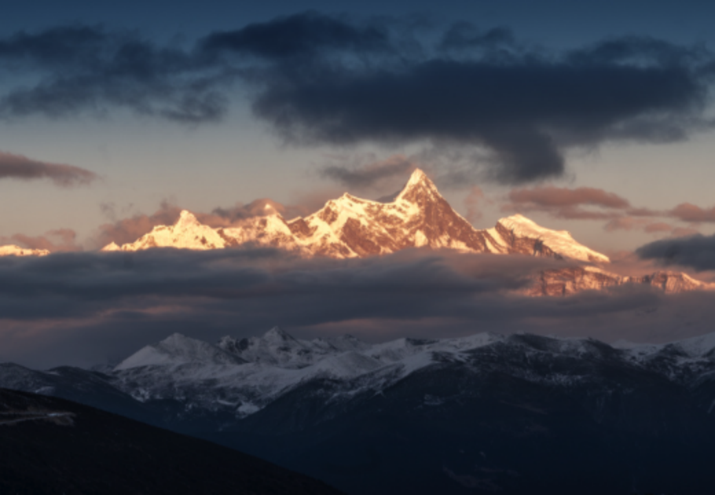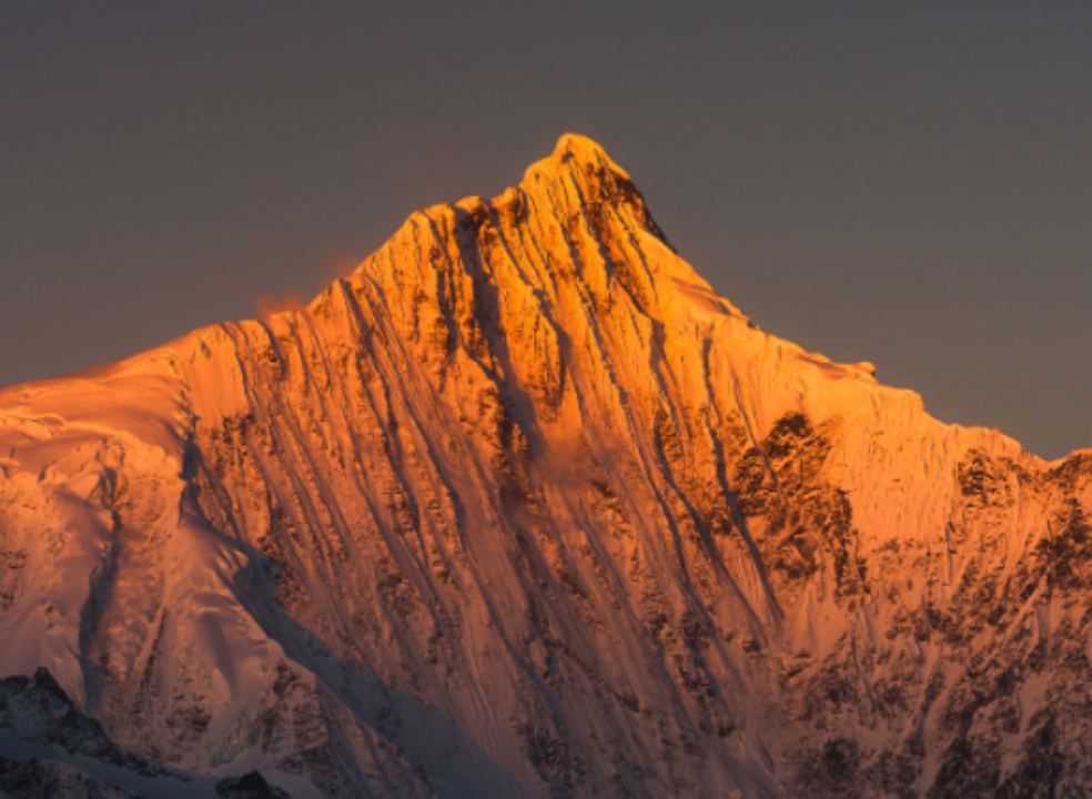 其次,四川甘孜州的贡嘎山同样以日照金山闻名遐迩。这座被誉为“蜀山之王”的雪山,海拔7556米,雄伟壮观。尤其是海螺沟景区,其三号营地海拔约2980米,秋冬季节空气清澈,雪山与金色阳光的交融在此处尤为震撼,为游客提供了一个近距离欣赏日照金山的绝佳平台。