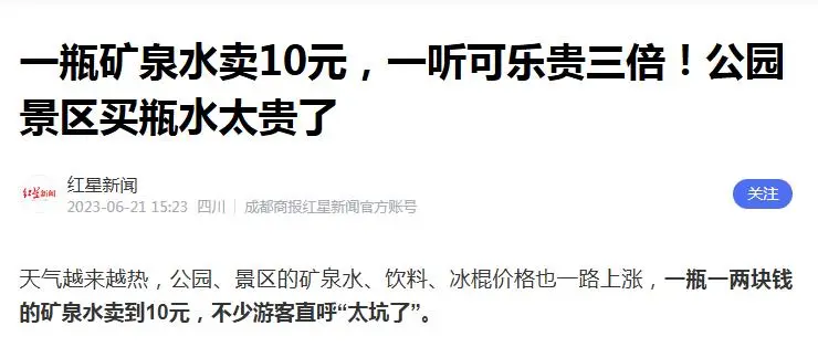 以矿泉水为例,大部分景区都会卖到每瓶10元。如果不是在景区,矿泉水通常是1-3元一瓶,到了景区居然这么贵。