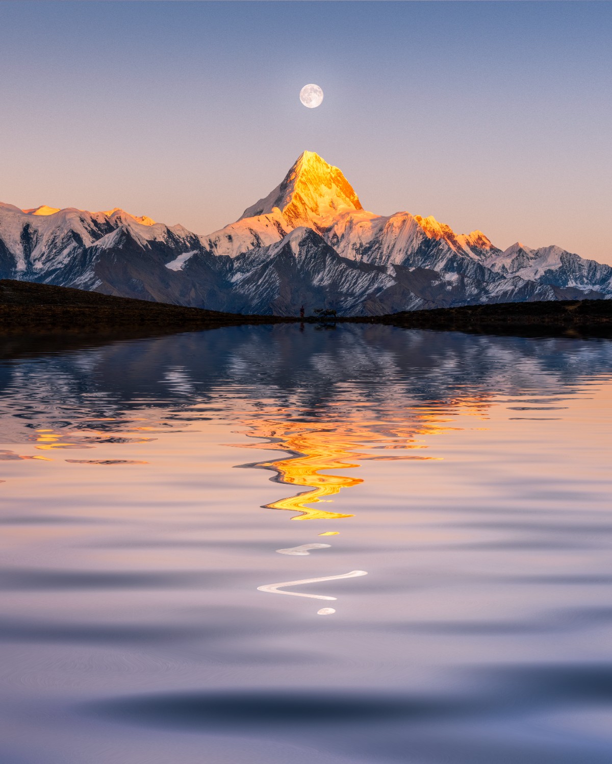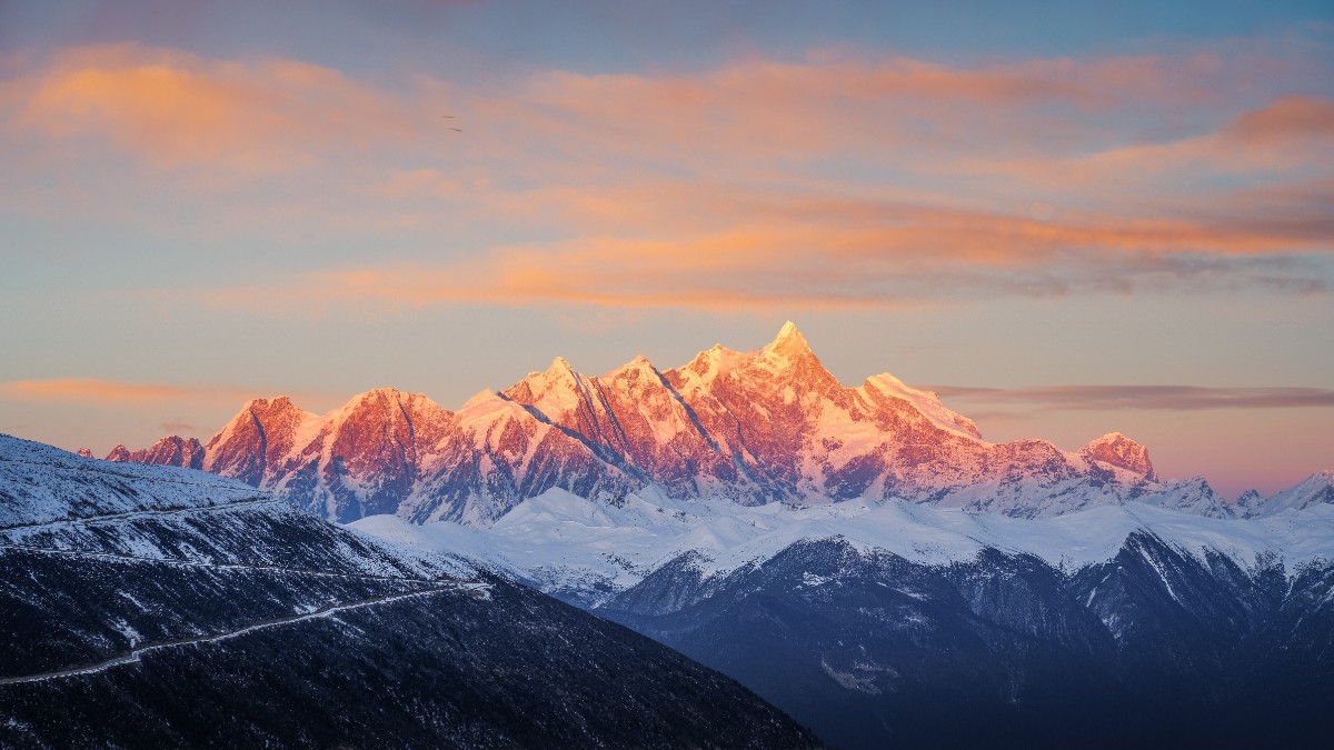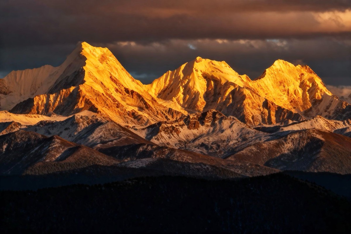 作为海拔7508米的“蜀山之王”,贡嘎雪山的日照金山自带王者气场,10月至次年3月是最佳观赏期。牛背山、鱼子西、子梅垭口等都是声名远扬的观赏点,其中冷嘎措的湖水能清晰倒映出金山的身影,水面波光与山巅金光交相辉映;雅哈垭口、红海子等则能捕捉到雪山与云海同框的鎏金盛景。