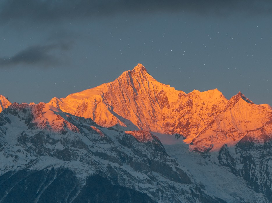 与四姑娘山同海拔6740米的梅里雪山,是藏民心中的神圣之地,10月至次年5月大概率能遇见日照金山。飞来寺是最便捷的观赏点,清晨推开窗就能看见雪山鎏金的瞬间;深入雨崩村或前往雾浓顶,能在静谧的村落与层叠的山峦间,感受神山鎏金的庄严与浪漫。