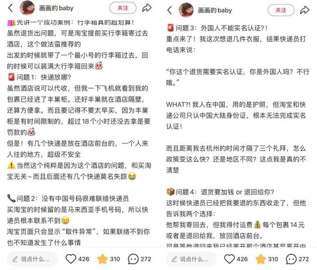 今年 5 月去成都旅行时,为了装淘宝买到的 20 多件商品,她特意网购了行李箱。但在退不合适的衣服时遇到了问题,由于快递需要实名认证,只有护照的外国游客很难操作,最后只好请快递员帮忙退货,但每个包裹需要多付 14 元的运费。