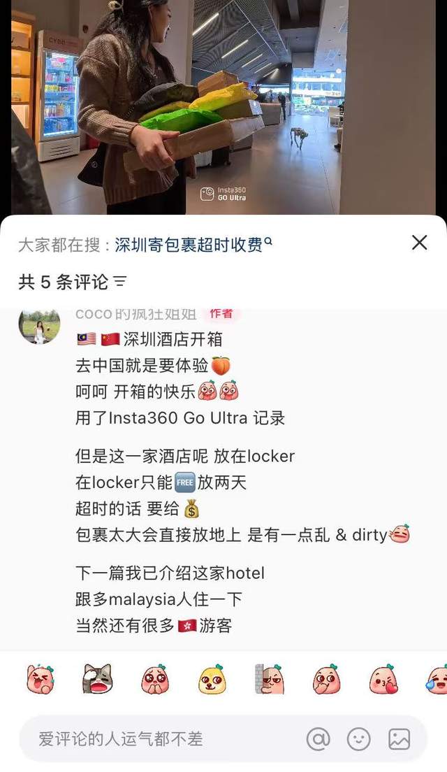 马来西亚游客@coco的疯狂姐姐 就用 Insta 360 Go Ultra 记录下了从深圳酒店的储物柜里拿取包裹的过程,并表示“去中国就是要体验”。