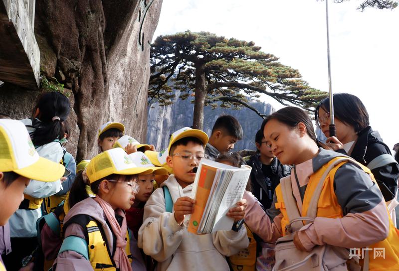 学生秋假游黄山对着课本感受黄山奇松怪石(央广网发 王磊 摄)