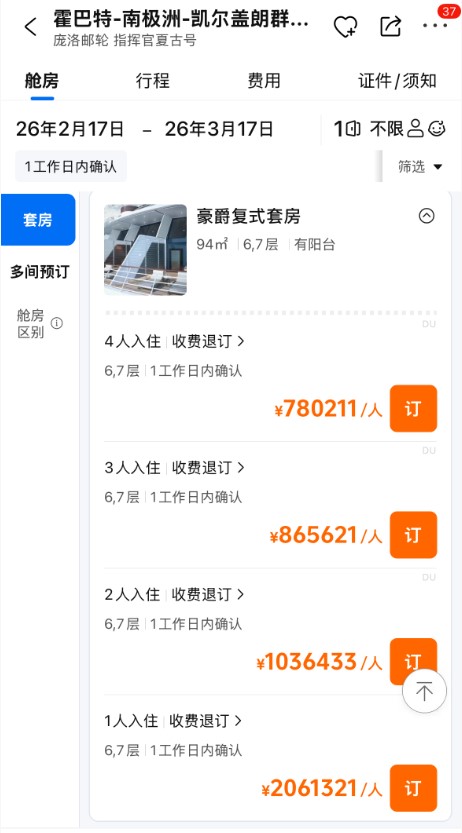 而被俞敏洪带火的“指挥官夏古号”,是庞洛邮轮旗下,全球第一艘PC2破冰级邮轮,俞敏洪在微博中表示,夏古号12天价格在20万-25万之间。蓝鲸记者在OTA平台检索发现,指挥官夏古号目前在售卖的2026年2月17日登船的29天28晚的邮轮产品,航线为“霍巴特-南极洲-凯尔盖朗群岛-开普敦”,其中,邮轮6-7层的豪爵复式套房双人入住价格为103.64万元/人、单人入住价格超200万元。