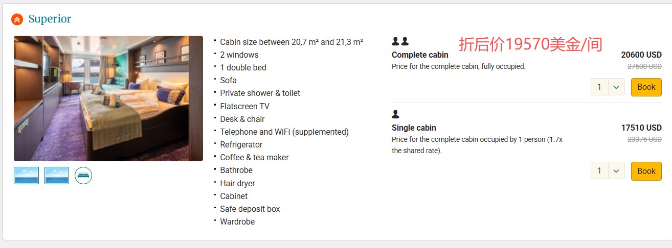 实际上,同一艘邮轮,高级套房的价格就变成了19570美金/间(约合人民币13.83万元/间),两人平均,单人邮轮费在6.9万元左右。