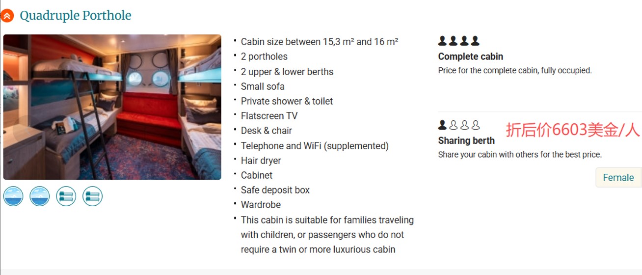 蓝鲸记者从旅行社获悉,在售卖的5万元南极游产品仅为船票,旅行社提供的邮轮价格显示,四人舷窗房折后价格在6603美金/人(约合人民币4.67万元/人),舱房面积在15.3-16平方米,舱房为4人间,分为两个上下铺。