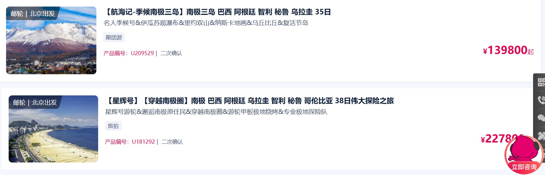 此外,有旅行社南极游产品界面显示“二次确认”标识,蓝鲸记者获悉,“二次确认”是指相关产品的库存需要进一步确认,可能已经售罄,或者部分产品来自此前完成购买,但因行程有变无法按时前往的游客的退票,在预订时,游客需要和旅行社再次确认。