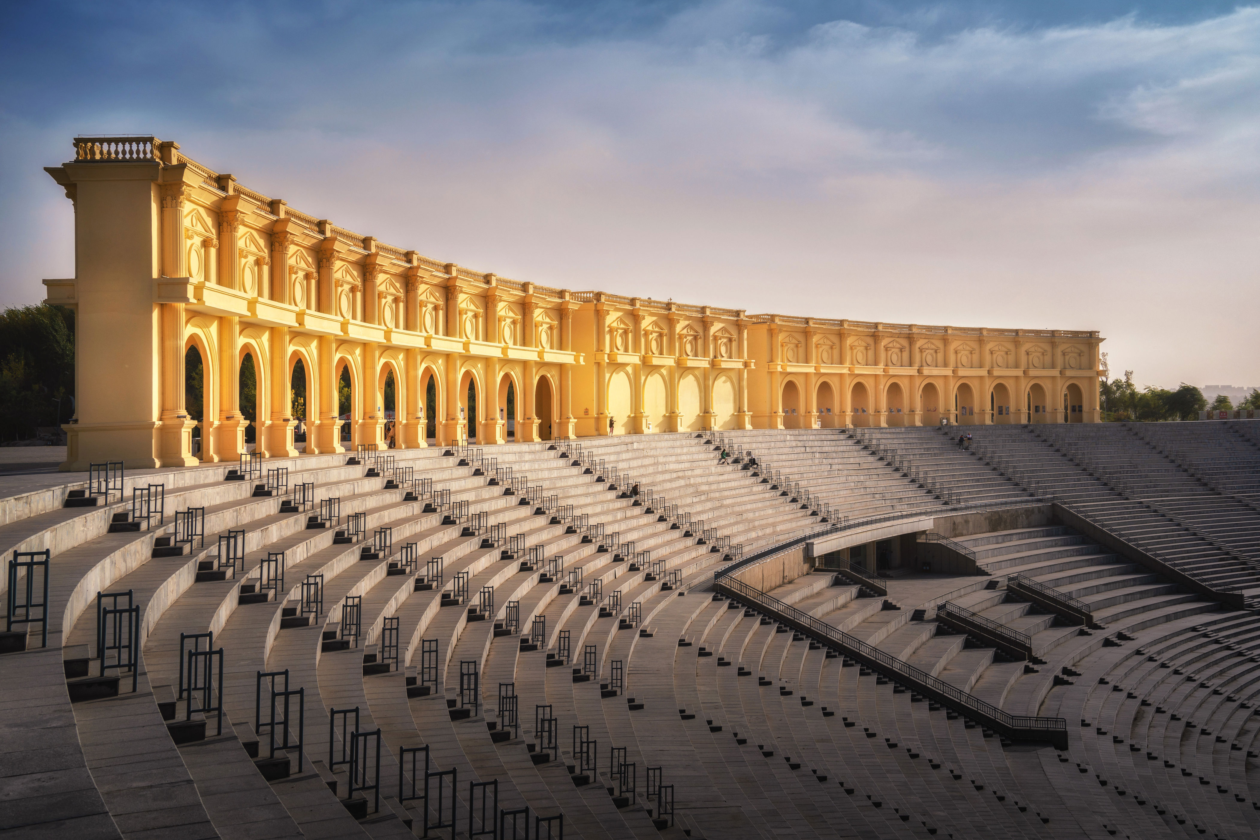 坐在层叠的看台上看一场日落,柔和温暖的光线照在米黄色的罗马柱上,真的绝美,电影感直接拉满!