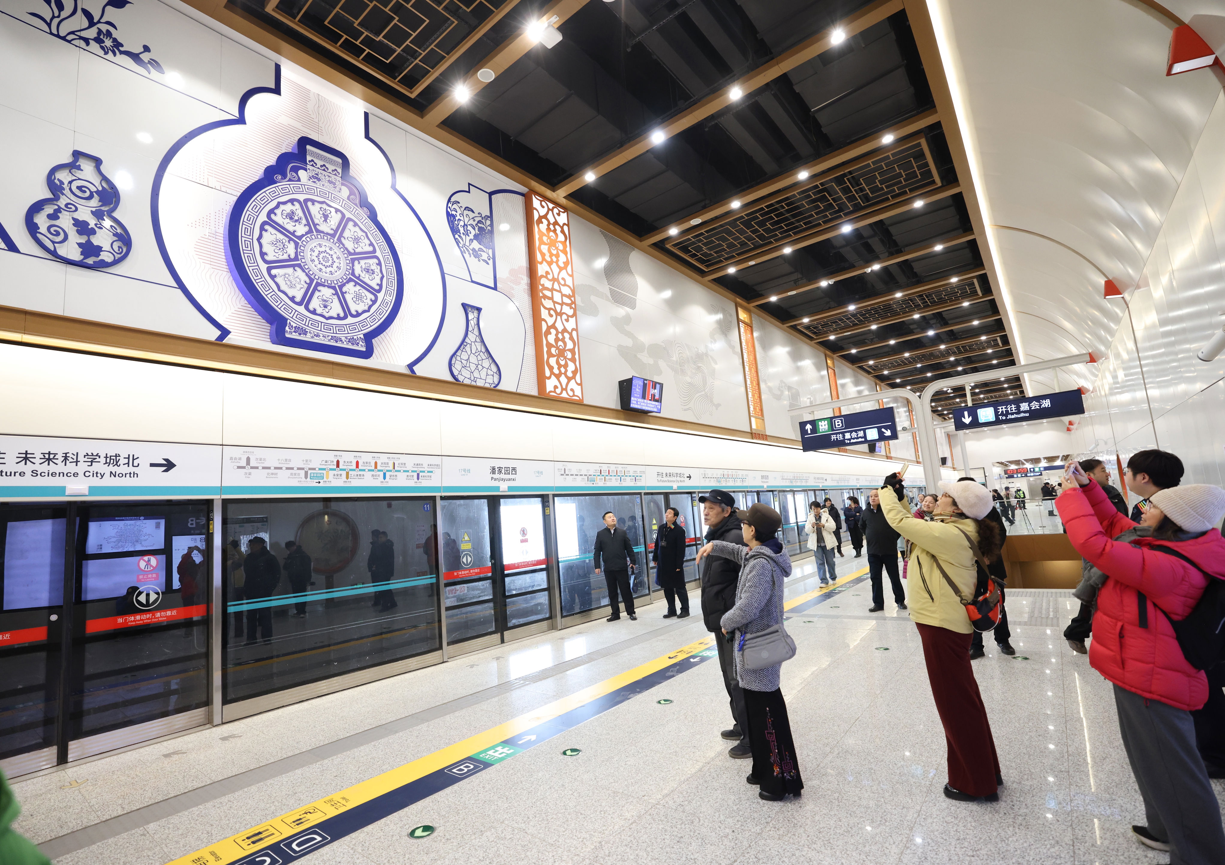 17号线中段车站的设计充分融合地域文化。例如,永安里站采用新中式风格,以米色为主色调,衬以褐色线条与顶部藻井造型,展现中式空间之美;站内布置“东方之韵”主题壁画,创新运用玻璃瓦片融入故宫、太庙等经典古建筑剪影,传递北京文化底蕴与都市活力。潘家园西站则结合结构空间特点及周边文化元素,融入青花瓷、古画、花格等传统纹样,呼应站点周边文化氛围。