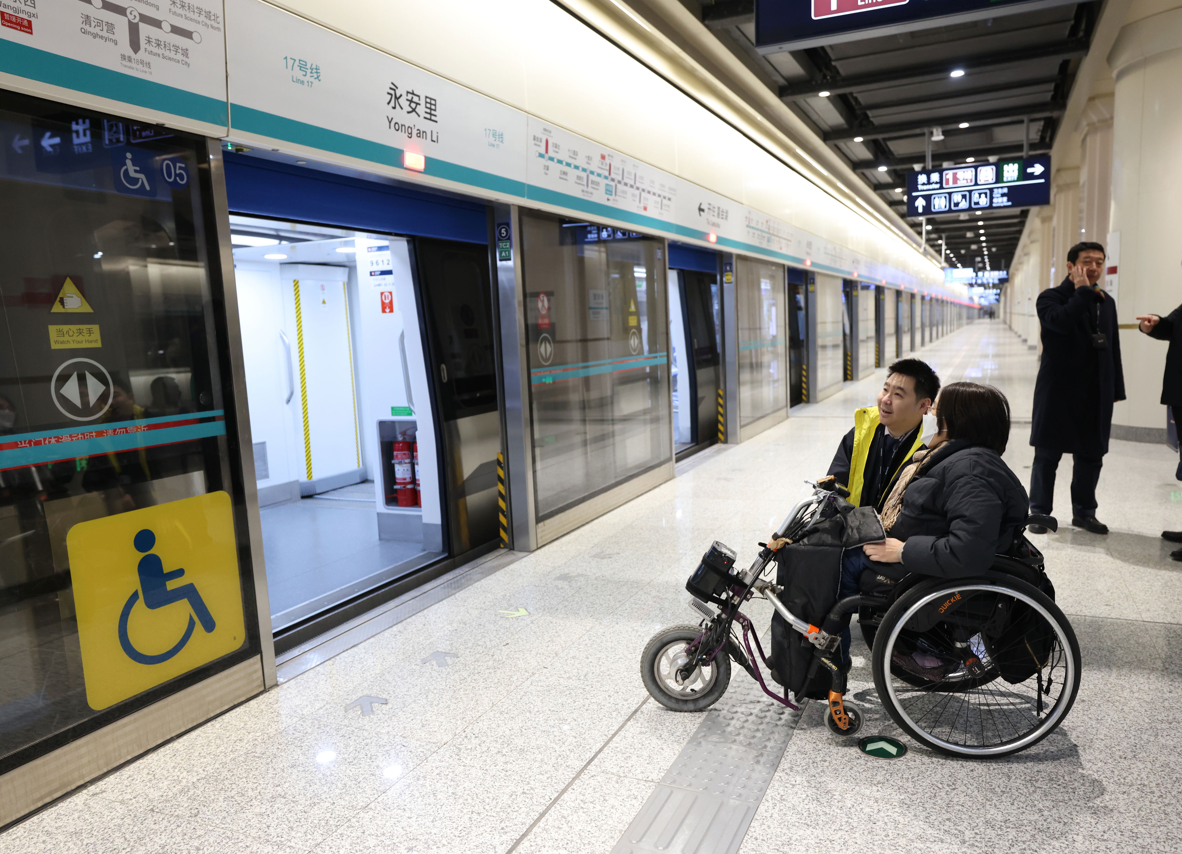 服务设施方面,京港地铁运营经理徐亮告诉记者,17号线中段全线车站均配备母婴室、家庭式无障碍卫生间及AED急救设备。潘家园西站和永安里站延续使用双面开门直梯,并优化开门方向,极大方便了轮椅乘客进出。针对冬季候车,站台座椅全部加装暖心坐垫;针对外籍乘客较多的永安里站,配备了多语种翻译机并优化双语标识。
