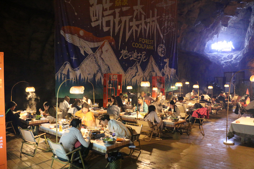 在酷玩森林的地下深处,探险者们头戴照明设备,穿越亿万年形成的钟乳石,体验绳降、溜索和洞穴秋千等多种地心探险方式。探险结束之后,既可在常年保持15摄氏度的洞穴餐厅享受热气腾腾的火锅,也能在距离地面200米的崖壁上品味一杯醇香咖啡。
