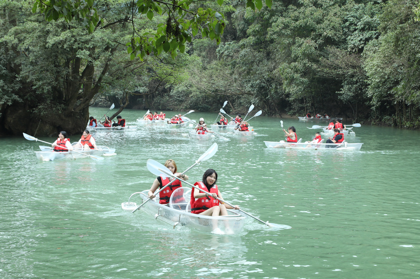 游客在鸳鸯湖划透明船。
