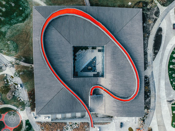 上房揭瓦照进现实,来金牛区蜀道通衢园区就可以实现。园区内有一条沿着屋檐而上,高差10米,形如爱心的橙红色栈道,建筑的外墙搭配的是透明的玻璃墙,台阶处是灰色的,色调偏向于暖色调。它是穿越回古蜀道的轨道,也是古蜀主题的一个缩影,它除了有很强的观赏性之外,还是中医药文化传播的载体,在这里可以看都蜀医的展览、也可以吃到药膳等美食。