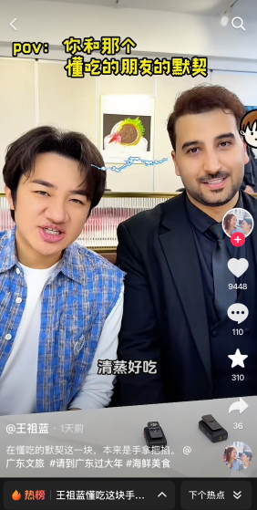 首期节目上线,相关热点话题迅速登上抖音热榜,热点话题#王祖蓝懂吃这块手拿把掐登上抖音深圳同城榜top2、全国娱乐榜top44位。