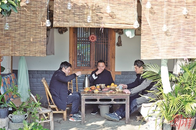 重庆市北碚区天府镇文星村的弄泉斋民宿内,游客围炉煮茶。 新华社发