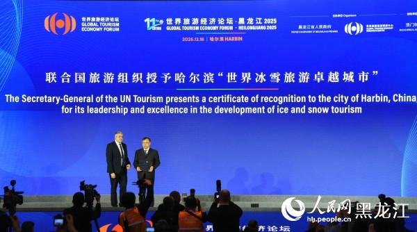 人民网哈尔滨12月16日电(记者韩婷澎、徐成龙)12月16日,第十一届“世界旅游经济论坛·黑龙江2025”在哈尔滨召开,联合国旅游组织授予哈尔滨“世界冰雪旅游卓越城市”荣誉称号。