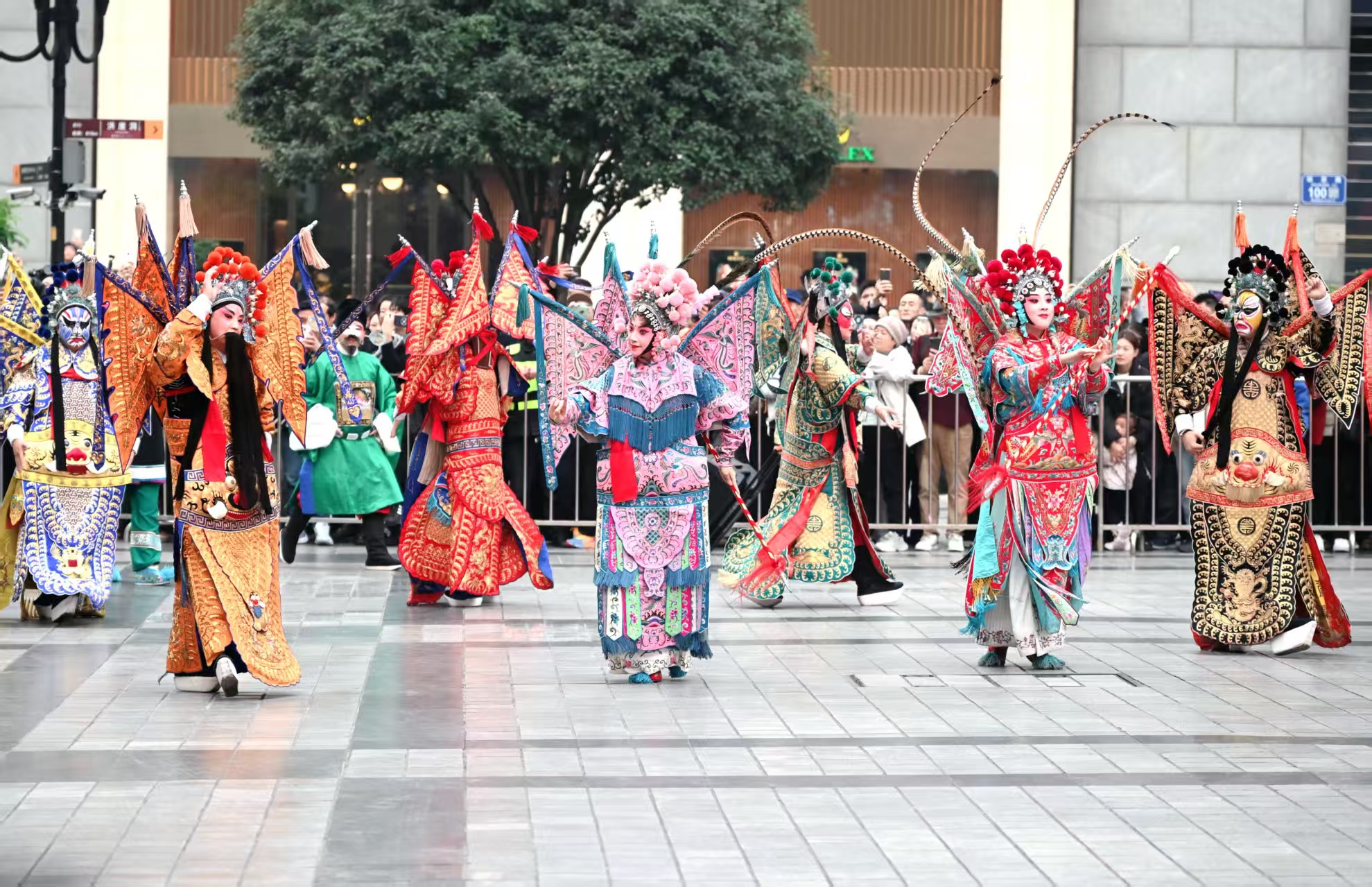 2号花车带着“戏曲”走近观众。重庆市曲艺团、重庆市川剧院的演员们化身关公、穆桂英等戏曲经典角色,现场演起了武生短打、花枪、小跟斗等节目。