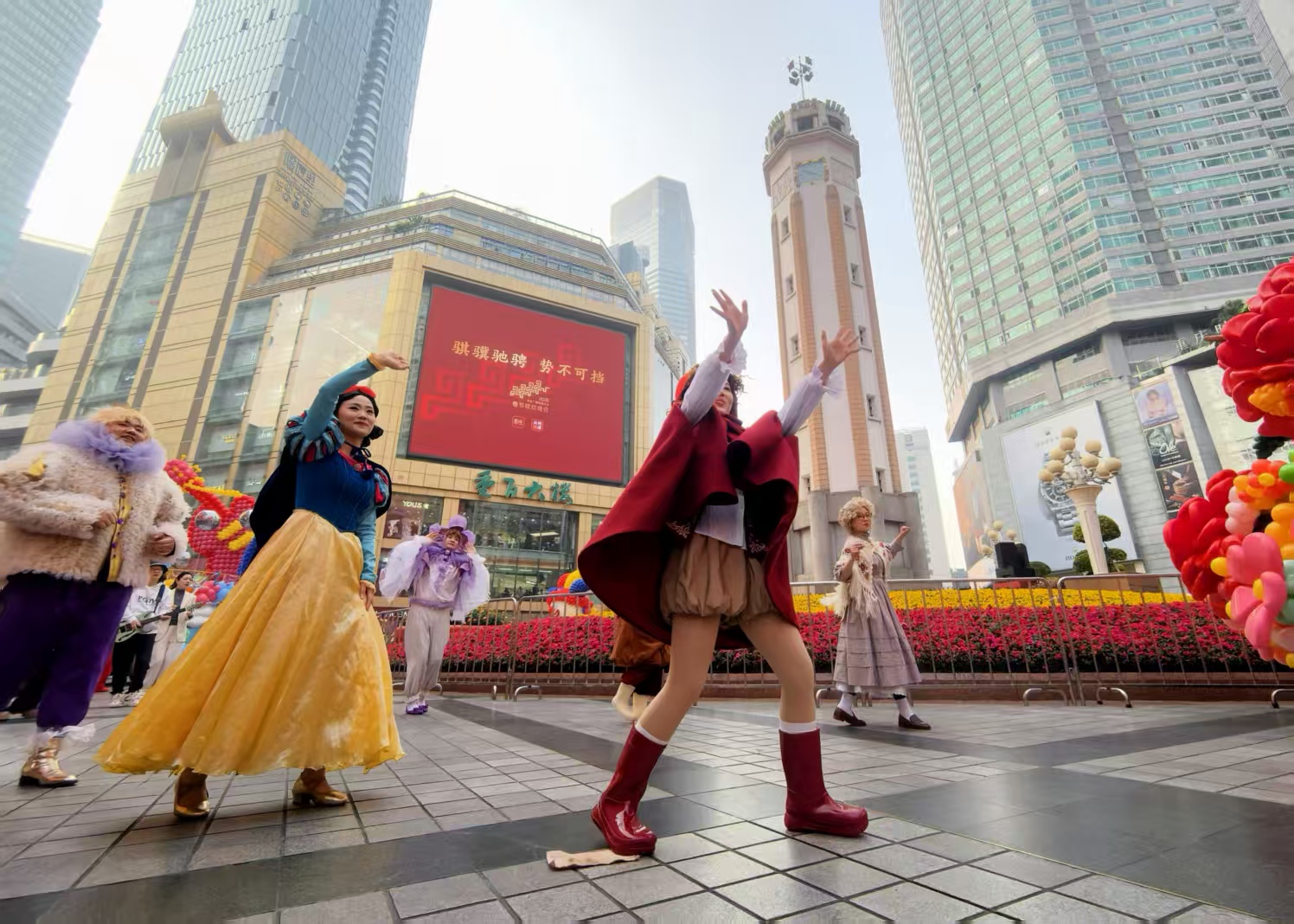 “这不仅是一场送给广大市民、游客的文化盛宴,也是重庆各文艺院团的艺术展示。”本次巡游活动的总导演、重庆市杂技艺术团团长陈涛表示,本次巡演一共吸引了超过120名来自全市各文艺院团的优秀演员参与,扎制4辆花车所用的气球接近10万个。表演团队与艺术装置沿解放碑步行街主干道有序行进,形成一道流动的艺术风景线。同时,活动还采取了动态巡游和定点展演相结合的方式,实现“车停戏不停,步步有精彩”,营造出沉浸式艺术体验的氛围。
