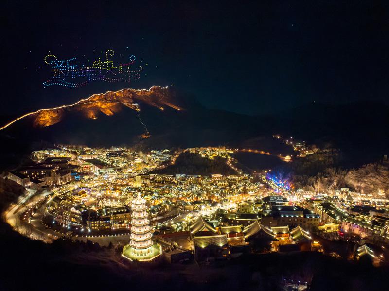 入夜后,科技与非遗秀演共绘视觉奇观:日月岛广场跨年音乐会以温暖旋律铺陈迎新序曲;千架次无人机腾空而起,在司马台长城之巅,绘就动态光影图案;与此同时,国家级非遗技艺“风火流星”、“打铁花”在长城脚下上演,1500℃铁水化作金色火瀑,与无人机光影、长城灯火交相辉映;鱼龙巡游队伍穿行于水镇大街小巷,将现场氛围推向高潮。当新年钟声敲响,游客可在日月岛广场见证无人机孔明灯缓缓升空,与巍峨长城、浩瀚星河共同构成一幅“人在画中、心向新元”的新年图景。