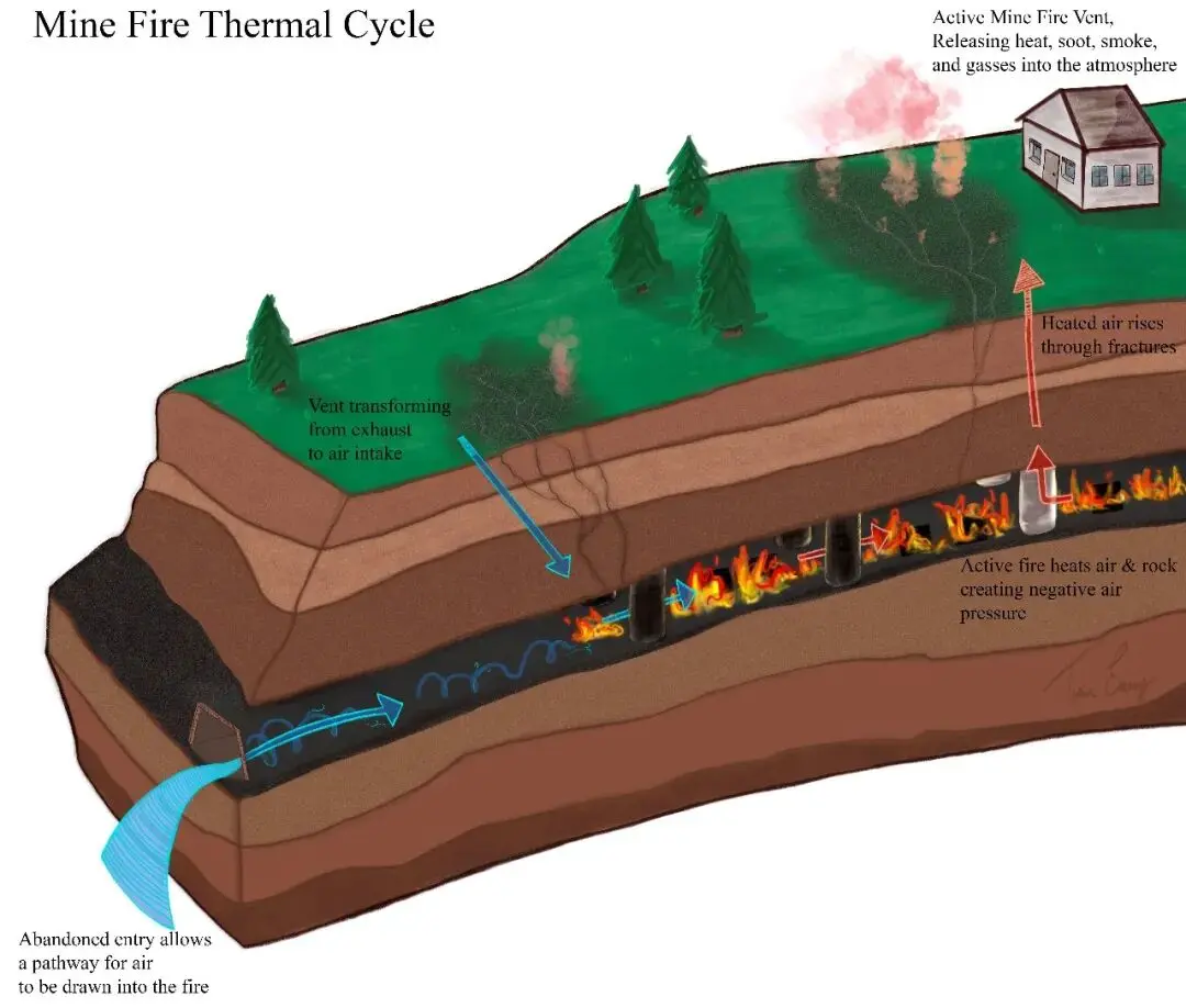 地下的火会将温室气体、有害气体和烟雾带到地面。|OSMRE