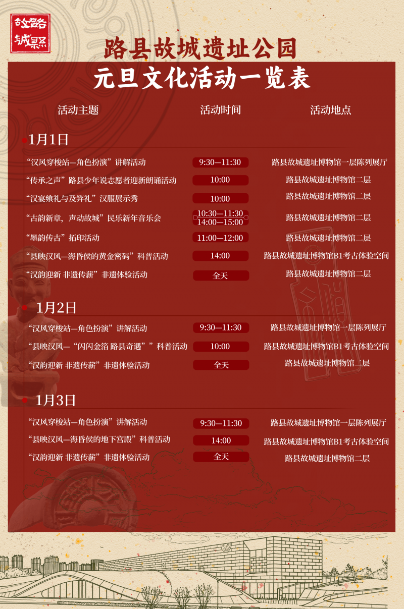 1月1日,路县故城遗址公园推出“古韵新章 声动故城”系列文化活动,涵盖汉服秀、民乐展演、非遗市集等多项特色活动,将汉代文化与节日喜庆氛围相融合,为市民游客献上一场沉浸式汉风文化体验。