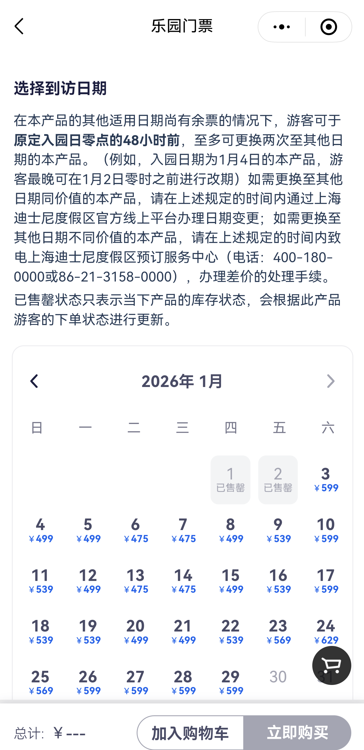 2026年1月1日和2日的迪士尼乐园门票均已售罄。上海迪士尼度假区官方小程序截图