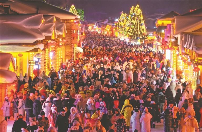 “雪城”牡丹江的旅游接待情况同样亮眼。在中国雪乡景区,雪韵大街上,锣鼓喧天,热闹非凡。身着鲜艳绸缎、腰系彩带的秧歌队翩然起舞,手中的扇子与彩绸随风飞扬,引来众多游客驻足围观、拍照喝彩。道路两旁,一座座覆盖着厚厚“雪蘑菇”的木质小屋在红灯映衬下,宛如童话世界。夜幕降临时,一盏盏大红灯笼渐次点亮,皑皑白雪在光影中变幻色彩,更为这份北国浪漫增添了梦幻气息。“这简直就像走进了童话书里”“屋顶上的雪那么圆润,太神奇了”……望着眼前的景象,游客们忍不住发出惊叹。