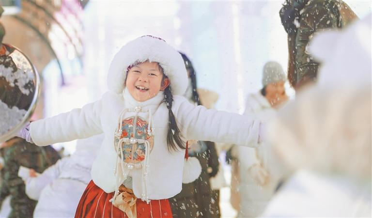 孩子在冰雪大世界飘雪长廊里嬉戏。
